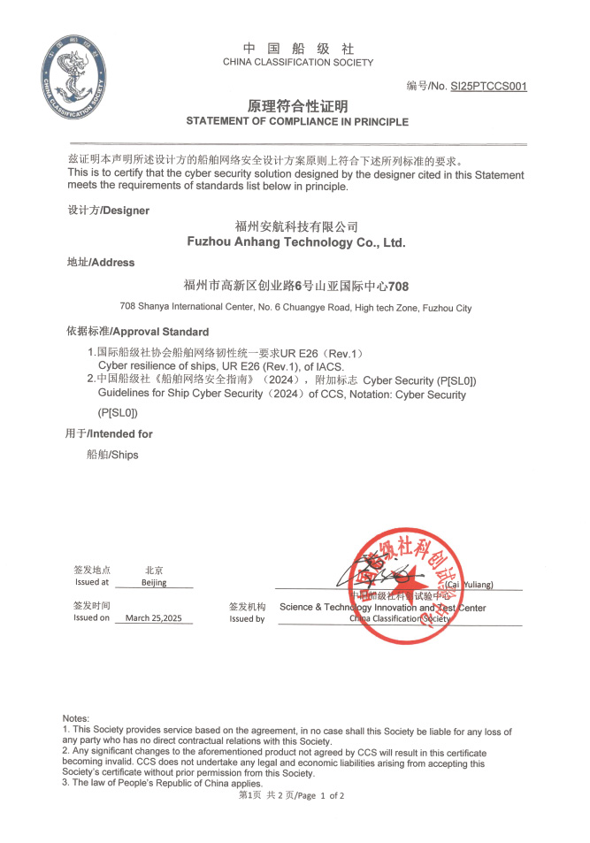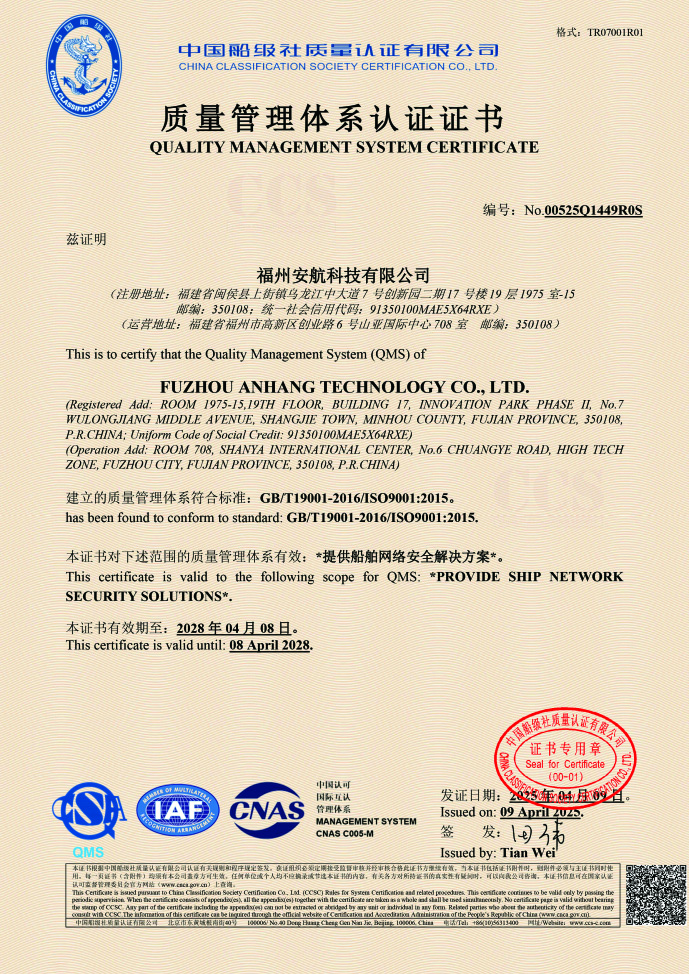 about 护航船舶网络守护海洋安全 福州安航科技有限公司是一家专注于船舶网络安全领域的新兴企业,乘载着航运业数字化转型的浪潮应运而生,怀揣着为全球船舶筑牢网络安全防线的热忱与决心,开启了守护海洋航行安全的征程。 我们秉持“护航船舶网络,守护海洋安全”的使命,立志成为船舶网络安全领域备受信赖的领军企业。在数字化航运蓬勃发展的当下,我们深知船舶网络安全对于保障航行顺利、货物安全以及海洋生态的重要性,致力于通过专业的技术与卓越的服务,让每一艘船舶都能在安全可靠的网络环境中畅行于广阔海洋之上。 |